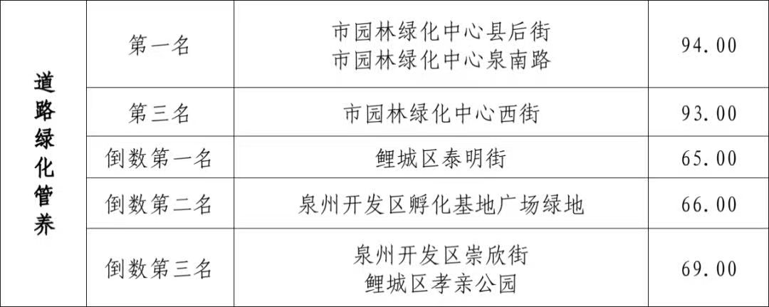 对中心城区53条(82段)内沟河及江岸带的市容和环境卫生管理情况进行抽评,所有受评河段均在70分以上,其中高于90分的河段有8段,其中丰泽区城东街道红树湾——城东旧海堤江岸带和东海街道海悦府——后渚港江岸带、鲤城区江南街道华远驾校——霞洲排洪沟江岸带卫生保洁到位,秩序良好,考评成绩靠前。但部分内沟河及江岸带的环卫作业质量不高,常态化保洁力度较为薄弱,考评成绩不理想,如丰泽区城东街道北渠两岸(海城花苑至安顺路)和北峰街道北渠两岸(丰顺北路至南北大道)、洛江区万安街道北渠万安段两岸。 道路绿化管养专项考评情况