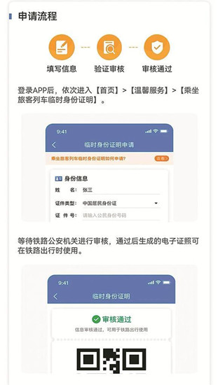 自助申请临时身份证明操作简单 记者体验了一下办理过程,打开手机铁路12306App,在首页点击“温馨服务”,之后点击“乘坐旅客列车临时身份证明”,填写身份信息,包括姓名、身份证号,填写后点击“立即申请”,点击温馨提示的“同意”选项后进入本人确认页面。点击“下一步”后,会自动打开前摄像头,进行当前申请人实人核验,主要是做“眨眨眼”之类动作,自动拍照后提交铁路公安审核,如果是本人信息,仅几秒钟就审核通过,十分方便快捷。核验通过后,稍等几秒即可查看电子临时乘车身份证明的审核结果。 “带着生成的二维码就能顺利刷码进站了。”客运员表示,电子临时乘车身份证明申请后在车站售退改窗口、实名制核验人工口/闸机以及进出站检票闸机和车上验票均能使用。 相 关 链 接 常见问题说明 问:电子临时乘车身份证明有次数限制吗? 试点期间,电子临时乘车身份证明每人在一个自然月可申请6次。如果申请超过6次,请前往车站的公安制证窗口办理纸质临时乘车身份证明。持纸质临时身份证明进站乘车,需要走人工核验通道。 问:电子临时乘车身份证明有有效期吗? 有。电子临时乘车身份证明在用户申请成功后24小时内有效。在旅行过程中电子临时乘车身份证明失效时,旅客可重新提交申请,或通过人工口办理出站手续。 问:未成年人是否可以申请电子临时乘车身份证明? 已办理中国居民身份证的未成年人可以申请电子临时乘车身份证明。 问:我可以用别人手机办理电子临时乘车身份证明吗? 可以。正确输入申请人的姓名、身份证号码就可以办理。 问:为什么我的城市定位功能无法正常使用? 您可点击“重新定位”尝试再次获取位置信息,同时确认手机定位服务已开启并授权12306App。 问:电子临时乘车身份证明二维码可以正常显示,但为什么无法通过闸机? 在电子临时乘车身份证明二维码使用页面,二维码60秒自动更新一次,可能是因为网络原因未能及时更新,请点击二维码下方“刷新”按钮。 问:为什么停留在电子临时乘车身份证明二维码使用页面一段时间后,提示要重新进行本人认证? 为了避免他人冒用,在电子临时乘车身份证明二维码使用页面停留30分钟后,需要用户重新通过实人核验确定本人操作。在临时乘车身份证明有效期内,该操作不占用申请次数。 (晓明 辑) |