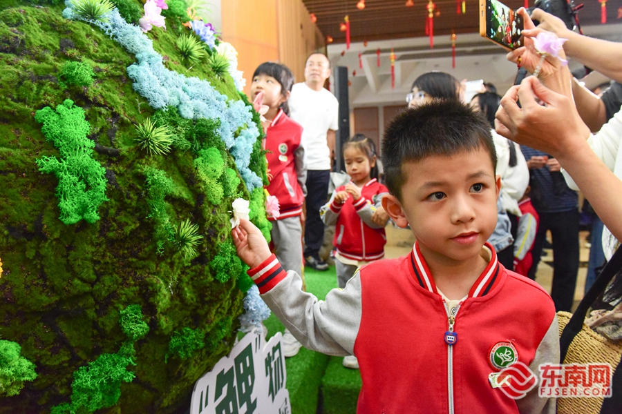 小朋友在“我为地球簪个花”共创环保装置前打卡拍照。东南网记者 林婕 摄