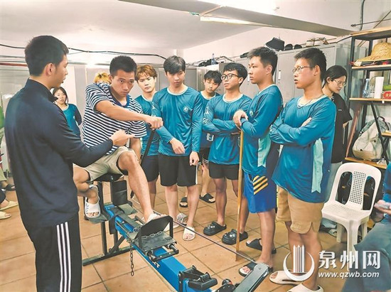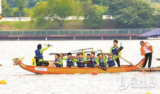 泉州经贸职业技术学院学生受训中(杜婉琼 摄) 全国冠军再征战传承龙舟精神 “咚锵!咚锵!咚锵!”昨日,在鲤城区浮桥街道的笋江上,鼓声与呐喊声此起彼伏。由50余名泉州市经贸职业技术学院的学生组成的龙舟队在这里开展训练,场面十分壮观。做完热身运动、穿戴好救生衣后,伴随着阵阵锣鼓声,男女队员们登上龙舟,喊着口号,动作整齐划一,龙舟如离弦之箭向江中冲去,在水面上划出一道道美丽的弧线,溅起一朵朵浪花。 尽管天气有些阴沉,但没过多久,人工智能专业大二学生曾金宝的衣服上已满是汗水,作为龙舟队的队长,他与龙舟结缘已近一年半了。“高中时有一个体育梦,终于在大学圆梦了。”曾金宝说,在高中时,他曾经想加入校排球队,但在一次意外中扭伤了脚,待伤好后已临近毕业,于是内心一直留有遗憾。大学时,得知学校的龙舟队在纳新,觉得新奇的他立马自荐加入。此次全队除了备战泉州端午期间的赛事,还将为暑期的全国青少年龙舟锦标赛做准备。 “刚开始练习时,感觉划龙舟比预想中难,有些枯燥。”曾金宝说,划龙舟时讲究身体的协调性,拉水时脚要前蹬,移桨时脚要后撑,虽然只是一个简单重复的动作,但要做到水下效果好并不容易。对于整支队伍来说,整齐度、力度及抓水效果是决定龙舟速度快慢的根本。去年七月初,为了备战全国青少年龙舟锦标赛暨U系列龙舟赛,他和队员们在校方和鲤城区浮桥龙舟队的安排下,到笋江边开展了为期一个半月的高强度集训,大伙儿拧成了一股绳,最终用辛勤的汗水和坚韧的毅力换来了全国第一名的好成绩。 王梦豪也是去年冠军队的队员。“龙舟队对于我来说像是精神寄托。”他说,刚进大学时对一切都很迷茫,不知道未来要从事什么,直到成为龙舟队的一员,他仿佛找到了努力的方向,“龙舟队让我结交到了不少好朋友,我很享受和他们一起拼搏努力的感觉,希望以后有机会以老带新,将‘顽强拼搏、奋勇争先’的龙舟精神传承下去。”