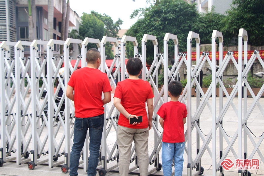 泉州市第九中学考点外,不少家长们在考场外送考等候。林梦琳 摄