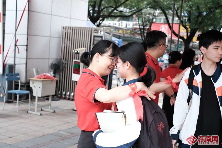 老师拥抱鼓励考生,为考生加油打气。林梦琳 摄