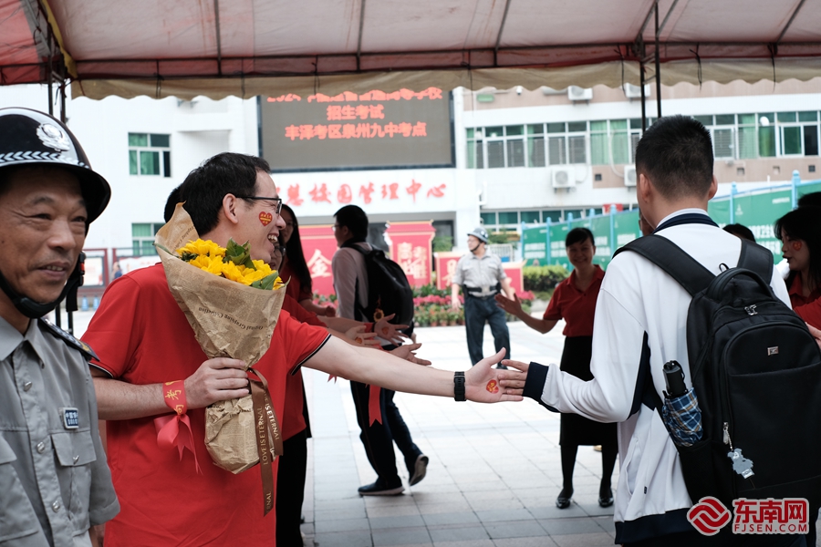 老师们手捧鲜花为考生加油助威。林梦琳 摄