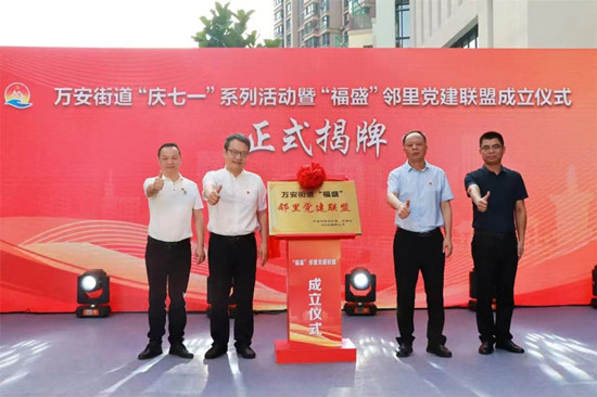 揭牌仪式。庄伊欣摄 东南网6月24讯(本网记者 薛逸群 通讯员 庄伊欣)日前,万安街道“庆七一”系列活动暨“福盛”邻里党建联盟成立仪式在万盛社区“党建+”邻里中心举办。区委常委、组织部部长王志宏,区委常委、统战部部长曾国家参加。 现场,王志宏、曾国家等与会领导共同为万安街道“福盛”邻里党建联盟揭牌。“福盛”邻里党建联盟由万福社区党总支、万盛社区党总支组成,以“党建引领聚合力、资源共享暖邻里”为工作理念,合力打造邻里互助、和谐共治的新格局。 仪式上,王志宏为老党员代表颁发“光荣在党50年”勋章;曾国家为万福“爱心馒头”、万盛“邻里集市”党员志愿服务团队代表授旗。 与会领导还分别为首批“共建商户”授牌以及首批“优秀网格员”“最美楼栋长”颁发证书。 此外,“福盛”邻里党建联盟共建商户代表宣读“邻里守望 温暖相助”倡议书;万福、万盛社区负责人分别从多元化治理、资源共享平台、邻里驿站建设等角度作邻里中心运营理念分享。 成立“福盛”邻里党建联盟,旨在探索邻里党建联盟新路径,以党建为“粘合剂”,整合社会组织、商业服务机构和个体经营者等多类型资源,为社区居民提供托幼、家政、康养、超市、理发、餐饮等专业化、优质化的服务,让社区从“治理难”到“共同治”,从“服务有”到“服务优”。 为庆祝中国共产党成立103周年,现场还开展“庆七一”系列活动。闽南童谣舞台剧《重游泉州城》、朝鲜鼓舞《红太阳照边疆》、国学礼仪《礼》、男声独唱《蓝蓝泉州湾》等精彩节目轮番上阵。以鲜活、丰富多样的演出形式,充分展现广大群众热情和积极向上的精神风貌。 活动当天,还组织社区党员、群众集中观看爱国电影《建党伟业》;并在万福、万盛“党建+”邻里中心分点开设万福“日咖夜酒”、万盛“邻里集市”,现场交织着叫卖声、欢笑声,呈现出浓浓的社区“烟火气”。 |
