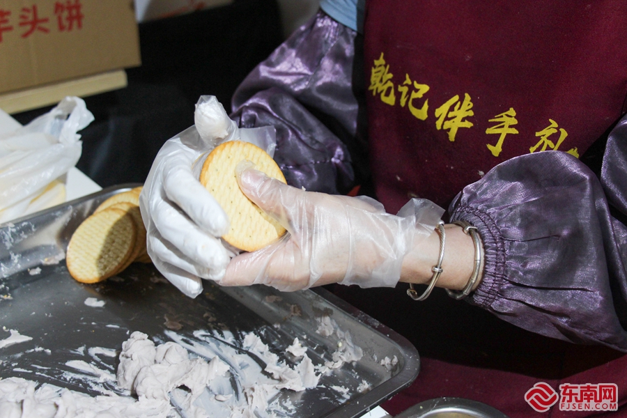 制作芋头饼需要将厚厚的芋泥包裹进饼干中。林梦琳 摄