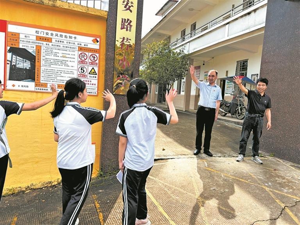 洪明春在教室里为3名学生开闭学式 “如果让她们转学,她们很可能就辍学了” “校长兼校丁,做饭兼敲钟”,这句闽南语俗语是洪明春真实的写照。 1992年,洪明春在自己毕业的第二年,背着行囊和对家乡的热爱回到蕗荇村,进入自己的母校路荇小学,开始了他的教学生涯。 “当时学校有100多名学生,后来最多时招收了200多名学生。”洪明春的记忆还是那么清晰,但无法阻挡时代的潮流。随着经济社会的发展,外面发展的机会越来越多,越来越多村民外出营生,学生也越来越少。3年前,学校仅剩3名学生,老师退休的退休、调走的调走,他却坚持留下。“我是大山的孩子,深知良好的教育对山区孩子的重要性,只要还有一个孩子在这所学校读书,我就想尽自己所能,教授他们知识,帮他们开阔眼界,助他们走出大山,未来报效家乡。” 其实,3年前,校方也考虑过让这3名学生转到隔壁大演村的大演小学。“但她们的家庭情况比较特殊,如果让她们转学,她们很可能就辍学了。”苏德强分析,大演村距蕗荇村约3公里,这不算远的路对这3个家庭,却是极难跨越的路途。苏德强接着说:“这3个孩子的家长多在外打工,只跟奶奶或亲戚住在一起,家庭困难,接送也是个大问题。所以,我们决定把学校办下去,直到她们毕业。下学期,她们升入华美中学读初一,就能住校了。” 据悉,路荇小学现有的教学设施会继续保留,由蓬华中心小学和蕗荇村委会协商管理,拟改建为新时代文明实践站、青少年寒暑假活动中心,让节假日返乡的孩子们有一个属于自己的天地。后续只要有新生或学生回流,学校还可以申请重启。