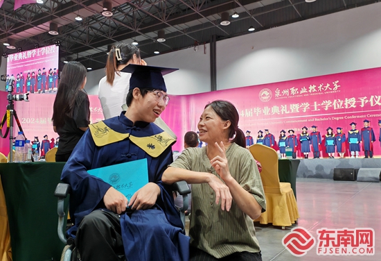 两名毕业生与校长合影,并向学校比心。泉州职业技术大学 供图 “每次听到你们的好消息,总是不免热泪盈眶,为你们点赞,为你们自豪!”泉州职业技术大学校长吴滨如说,并以“过往不念,当下不杂,未来不惧”这句话寄语全体毕业生,希望他们在面对未知的未来,不要害怕、放心去飞。 而在2024届学士学位授予仪式上,第一位上台接受校长拨穗正冠、领取学士学位证书的学生名叫吴祥瑚,是该校2022级专升本计算机应用工程专业毕业生。他是在母亲的搀扶帮助下走上台的。 原来,吴祥瑚在五岁时不慎摔倒、颅脑损伤后,导致行动不便。可他从未因此放弃学习,而是不断努力坚持,直至2022年从闽西职业技术学院考到泉州职业技术大学。本科学习期间,他非常认真,学习成绩一直保持在班级的中上水平,获得老师同学们的一致好评。 “今天能见证儿子的毕业仪式,陪着他走上台、拿到学士学位证书,我也很开心!感谢老师同学平时对儿子教导和帮助,让他学到很多有用的知识。希望我儿子毕业后能如愿找到适合自己的工作,将来能更好地照顾自己。”吴祥瑚的妈妈吴菊英告诉记者。