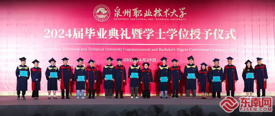 毕业典礼现场。泉州职业技术大学 供图 东南网6月29日讯(本网记者 施远圻)今天下午,泉州职业技术大学举行2024届毕业典礼暨学士学位授予仪式,3283名毕业生齐聚一堂,参加毕业典礼。 毕业典礼现场,工作人员先后宣读《关于准予2024届潘颖等3283名同学毕业的决定》《关于表彰2024届考取硕士研究生毕业生的决定》《关于表彰2024年大学生志愿服务西部计划志愿者的决定》《关于表彰2024届优秀毕业生的决定》《关于表彰2024届早锻炼毅力奖的决定》。 27名同学考研成功、超20%进入企事业单位及民营头部企业工作、154人获得优秀毕业生称号……泉州职业技术大学2024届毕业生,每个人都在摸索最适合自己的道路,并取得一定成绩,更好地朝人生下一阶段前进。