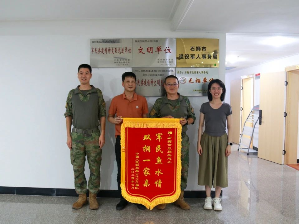 近日,来石驻训部队将一面写有“军民鱼水情 双拥一家亲”的锦旗送至石狮市退役军人事务局,对石狮市大力支持部队驻训致以诚挚的感谢。