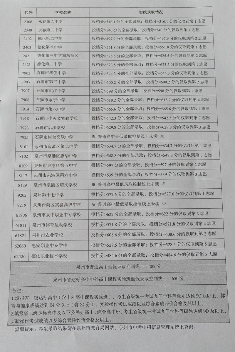 泉州市教育局温馨提示:考生录取结果请在泉州市教育局网站、泉州市中考中招信息管理系统上查询。