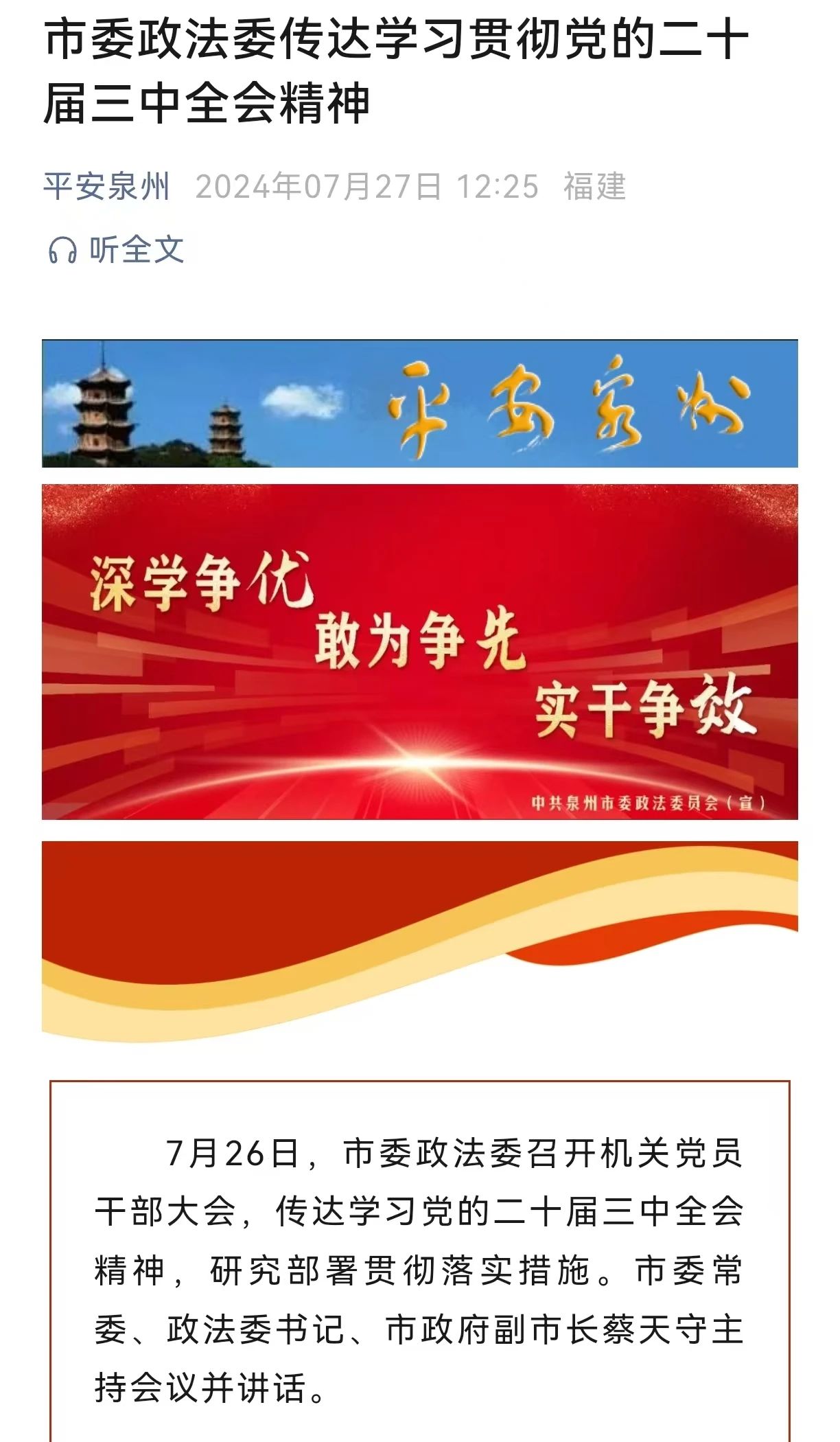 据中共泉州市委政法委员会官微“平安泉州”报道:7月26日,市委政法委召开机关党员干部大会,传达学习党的二十届三中全会精神,研究部署贯彻落实措施。市委常委、政法委书记、市政府副市长蔡天守主持会议并讲话。