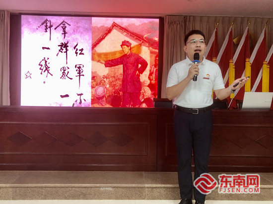 活动现场。雷婷 摄 在烈士纪念馆内,宣讲员根据城东街道属地情况,延伸介绍了籍贯在城东街道的烈士事迹,如舍生取义的旅菲抗日英雄——万善宗烈士,并结合《英雄烈士保护法》对加强社区内零散烈士纪念设施的保护管理进行普法宣传。 随后,泉州红色故事宣讲团、泉州市直机关“刺桐红”宣讲团成员蔡君雄带来题为《红军不拿群众一针一线》的双拥红色故事宣讲,同时为全体人员上了一堂深刻的党纪学习教育专题党课。蔡君雄讲述了朱德率军进驻永春福鼎村,践行“不拿群众一针一线”的组织纪律,播下红色革命的种子,让“军爱民、民拥军”的军民鱼水情深故事代代相传。 红色课堂活动结束后,泉州市革命烈士陵园保护中心全体党员干部还前往中国人民解放军长江支队泉州纪念园实地参观学习,重温入党誓词,过集体政治生日,为系列活动画上一个圆满的句号。