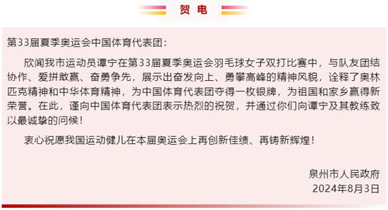 北京时间8月3日晚,在巴黎奥运会羽毛球女子双打决赛的激烈比拼中泉州永春籍运动员谭宁与她的搭档刘圣书经历了一场扣人心弦的对决,最终惜败于队友陈清晨/贾一凡组合荣获银牌,这是本届奥运会泉州的首枚奖牌,也是福建省首枚奖牌,意义非凡 作为“00后”中国女羽新星,谭宁凭借全面的技术和强劲的扣杀能力在羽坛崭露头角。她与搭档刘圣书默契配合,曾在短短几个月内连夺世界羽联巡回赛北极公开赛冠军、法国公开赛冠军、熊本大师赛亚军、杭州总决赛四强,今年来又先后夺得马来西亚公开赛冠军、印尼大师赛冠军,世界排名和奥运积分排名迅速冲入世界前三,展现出了非凡的实力和潜力,荣获世界羽联2023年度最具潜力奖。此番奥运首秀,谭宁成功摘银,解锁了自己的奥运新荣耀,充分展示了泉州人民的拼搏精神和良好形象,为家乡和祖国赢得了荣誉。 泉州市人民政府第一时间向第33届夏季奥运会中国体育代表团发出贺电