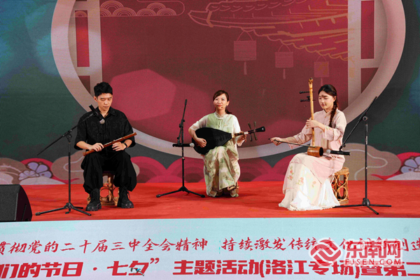活动现场。东南网记者 杜志鑫 摄 东南网8月10日讯(本网记者 张钰琪 杜志鑫)为深入学习贯彻党的二十届三中全会精神,深化拓展“深学争优、敢为争先、实干争效”行动,唱响“我们的节日”主旋律,让文化自信在广大群众心中历久弥坚,8月9日,泉州市在新时代文明实践点河市镇华优自然教育基地举办“我们的节日·七夕”主题活动暨第二届“陈三五娘”文化节。 仪式上,出席领导共同按下启动球,宣布泉州市“我们的节日·七夕”主题活动暨第二届“陈三五娘”文化节活动正式启动。据悉,接下来将有“陈三五娘”讲解员培训班、“陈三五娘”潮汕研学之旅等系列相关活动推出。 “陈三五娘”传说 演绎七夕文化魅力 活动现场,俞家棍表演、南音弹唱《阿娘听嫺》、讲古表演《陈三磨镜》……一个个精彩纷呈的节目轮番上演,赢得观众阵阵掌声,现场氛围活跃热烈,不仅给观众带来视听盛宴,也让大家在传统文化的熏陶下唤起共同的情感与记忆,一同探寻“陈三五娘”传说,感受七夕深厚的文化底蕴。 现场还特别邀请到了结婚50年的金婚夫妇和结婚25年的银婚夫妇,并为他们颁发了金婚、银婚纪念证书。“我今年72岁,我和妻子已经携手走过了49年的婚姻生活,我们相互包容理解,日子虽然平凡却十分满足。能在七夕这个特殊的日子得到祝福,感到非常开心。”刘世礼老人说。 “陈三五娘之所以深受欢迎,是因为这个故事发生在泉州,是我们身边人的故事,它冲破封建礼教束缚的精神让人感动,用闽南讲古独特的形式讲述故事也让人感到格外亲切。”泉州广播电视台《泉州第一炮》栏目嘉宾主持陈毅煌在接受采访时说道,“陈三五娘”传说是国家级非物质文化遗产。在文化传承方面,通过短视频等形式将陈三五娘的故事结合进去,让年轻人既能娱乐,又能在传统节日中感受到节日气氛,激发情感共鸣。 据了解,2014年“陈三五娘”传说被列为国家级非物质文化遗产名录,洛江区河市镇是故事主人公陈三的故乡,也是陈三五娘的归宿。近年来,围绕“陈三五娘”传说的保护和传承,洛江区开展了一系列工作来打造“陈三五娘”文旅品牌。通过整合本地现有历史遗存点打造“陈三五娘”文化园、建设“陈三五娘”主题园、成立泉州市洛江区陈三五娘传说文化研究会,为“陈三五娘”传说的传承和发展提供了学术支撑。同时,洛江区立足文化自信,丰富节日内涵,2023年首次启动“陈三五娘”文化节活动,推动文旅融合工作蓬勃发展。