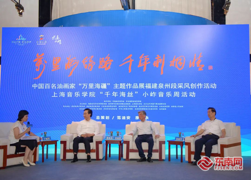 中国美术家协会主席范迪安(右)与中国音乐家协会副主席廖昌永(左)同台演绎“音画共融”。邓文祥 摄 启动仪式结束后,在随后召开的“音画海丝情”文化沙龙对话现场,中国美术家协会主席、中央美术学院原院长范迪安;中国音乐家协会副主席、上海音乐学院院长廖昌永及泉州市政协原副主席、福建省政府发展研究中心特约研究员李冀平围绕千年海丝的艺术魅力、艺术生活何以小岞岛、如何让艺术走进生活等主题开展对话。 据了解,此次活动主要分为中国百名油画家“万里海疆”主题作品展福建泉州段采风创作活动及上海音乐学院“千年海丝”小岞音乐周活动两部分。8月16日至25日,开展中国百名油画家“万里海疆”主题作品展福建泉州段采风创作活动,来自全国各地的24位画家将先后深入泉州市区、惠安县小岞镇、崇武镇及晋江市等地进行采风、写生,用手中画笔描绘“世遗之城”泉州的绰绰风姿。8月17日至22日,在惠安县小岞镇举办上海音乐学院“千年海丝”小岞音乐周活动,期间将举办“大海啊,故乡”——中国艺术歌曲音乐会、音画雅集活动、《南韵·国色》新媒体音乐会、特色音乐党课等活动。