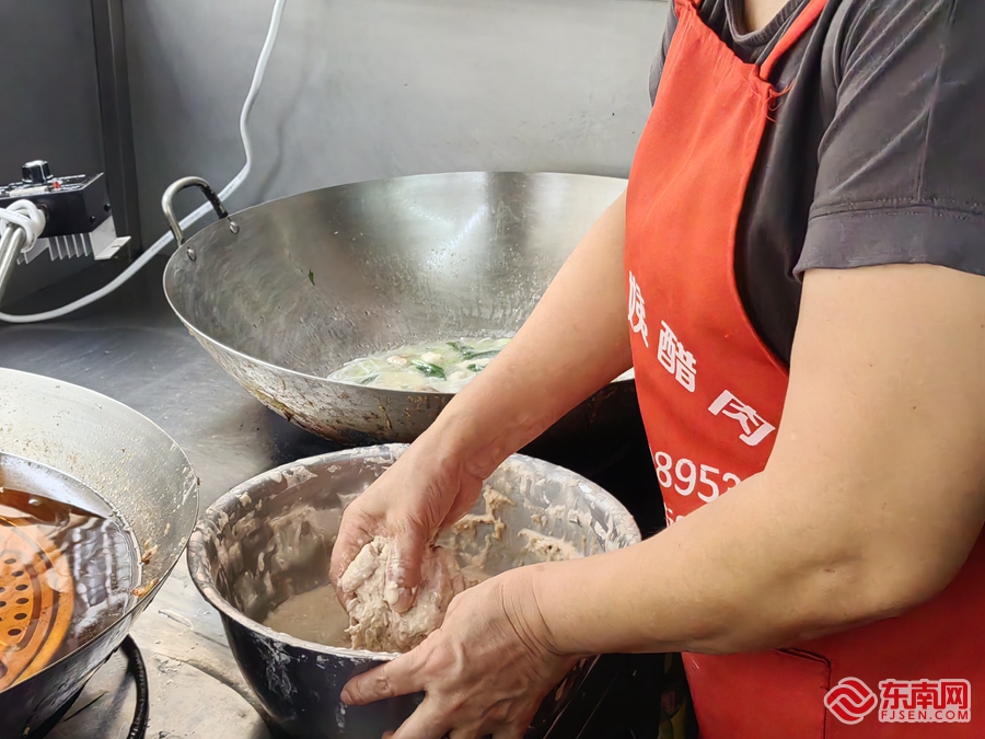 将猪肉抓拌均匀并准备下锅油炸。盛潇婷 摄