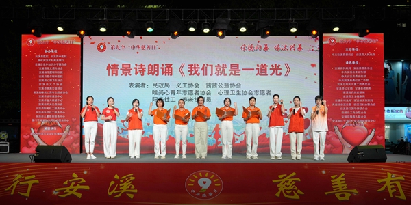 情景诗朗诵《我们就是一道光》。 晚会上,还开展安溪县2024年“慈善一日捐”现场捐款,安溪县2021年以来慈善优秀案例推介和展示,蓬莱镇、金谷镇慈善工作经验分享,公布安溪县“慈善一日捐”基金管理使用情况,发放慈善物资仪式,宣读《安溪县2024年“慈善一日捐”活动倡议书》等活动。 晚会现场还有慈善主题歌曲演唱、舞蹈表演、原创闽南答嘴鼓、诗朗诵等节目、精彩纷呈,引人入胜。 晚会期间,各类慈善机构、公益社会组织展示慈善活动剪影和慈善志愿者风采,“慈善一日捐”现场捐款,法律援助和《中华慈善法》宣传,心肺复苏急救知识培训和三救三献宣传,义诊,“书香跳蚤市场”义卖,义剪等慈善宣传和志愿服务活动同步举行。