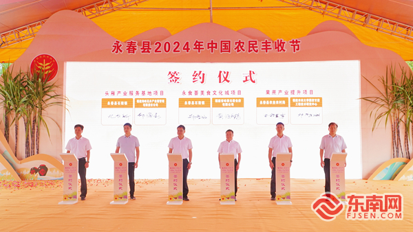 签约仪式。李育智 摄 东南网9月22日讯(本网记者 施远圻 通讯员 颜彩虹)春华秋实,又是一片喜庆丰收的景象。9月22日,2024年永春县“中国农民丰收节”活动在石鼓镇丰收广场举行,党员群众共联欢,共庆丰收、共享喜悦。 本次活动由福建省农业农村厅、泉州市农业农村局指导,永春县委、永春县人民政府主办,活动以“魁星岩前丰收景 十里桃源绘蓝图”为主题,由庆丰收、乐丰收、享丰收三大板块展开,涵盖自行车“十里桃源”骑行、好货展、音乐秀、美食品鉴,参观美丽庭院、甘蔗迷宫等活动,吸引了众多群众和游客前往参观。 以“节”为媒,活动在热闹喜庆的开场表演《舞狮》中拉开序幕。女声独唱《丰收中国年》、儿童舞蹈《禾稻梦》、乐器演奏《向光而行》等节目让观众领略农民丰收喜悦。现场还进行了“一县一溪一特色”田园风光项目和甘蔗品种园建设情况介绍,永食荟美食文化城项目、国家农业科技园区果蔗产业提升技术服务项目、头雁产业服务基地项目等三个项目的现场签约,将为永春县的农文旅发展注入强大动力。 其中,国家农业科技园区果蔗产业提升技术服务项目是永春县与福建农林大学国家甘蔗工程技术研究中心开展甘蔗全产业链合作,对传统甘蔗品种进行提纯扶壮,引进15个新品种甘蔗种苗,亩产产量可以增加一倍,每亩收益可以增加到2-3万元。