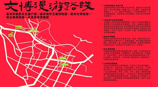 第三条路线:文博漫游路线【泉州非物质文化遗产馆——泉州海外交通史博物馆——泉州市博物馆——闽台缘博物馆——未来有印博物馆】:该路线依托丰泽辖区优秀传统文化和丰富的馆藏资源,带领市民游客穿越时空,开启智慧与美的文化盛宴,探寻文明的足迹,感受那些被岁月雕琢的珍宝所散发出的独特魅力。