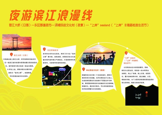 第二条路线:夜游滨江浪漫线【晋江大桥(日落)——东区野滩夜市——蟳埔民俗文化村(夜景)——上岸Sealand(“上岸”丰海路松弛生活节)】:顺着丰海路浪漫海岸线可以体验到极致的城市海洋美景、深厚的历史文化底蕴、绝美的海洋与城市交融的落日余晖、浓浓烟火气且有闽南特色的街头美食,还有火爆全网的有“头上花园”之称的蟳埔女簪花围非遗民俗。