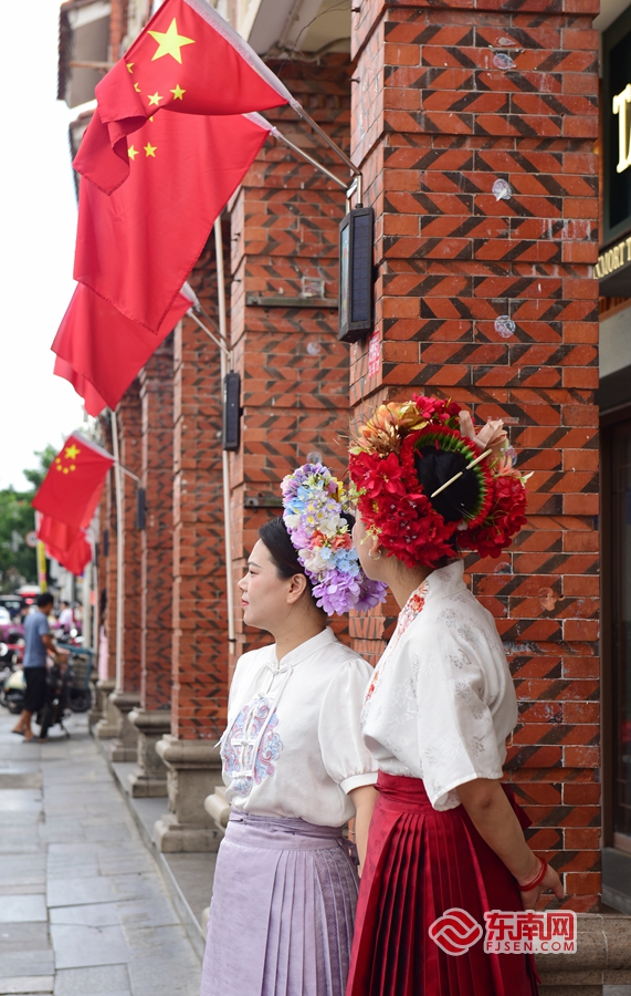 在泉州西街街头,两名簪花的游客在国旗下拍照打卡。东南网记者 林婕 摄