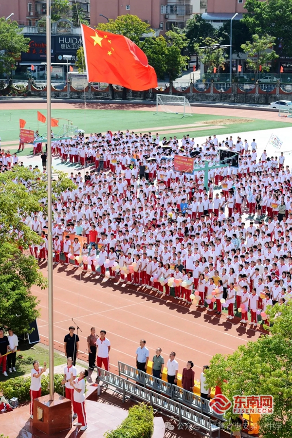 升国旗仪式。惠安一中 供图 东南网9月30日讯(本网记者 林杰)金秋九月,丹桂飘香,在喜迎中华人民共和国75周年华诞之际,9月28日,惠安一中第五十七届校园田径运动会如期而至。 本次学校运动会为期三天,场面热烈、氛围高涨。开幕式上,学校相关负责人勉励同学们在比赛中秉持团结、拼搏精神,希望全体师生谨记“生命在于运动”的道理,以这次运动会为契机,走进阳光,走进操场,以健康的体魄、充沛的精力、愉悦的心情投身到工作、学习、生活之中。随后,各班级代表队依次入场,队伍整齐划一,气势非凡。开幕式还举行了五祖拳广播操比赛,点燃了全场的热情。