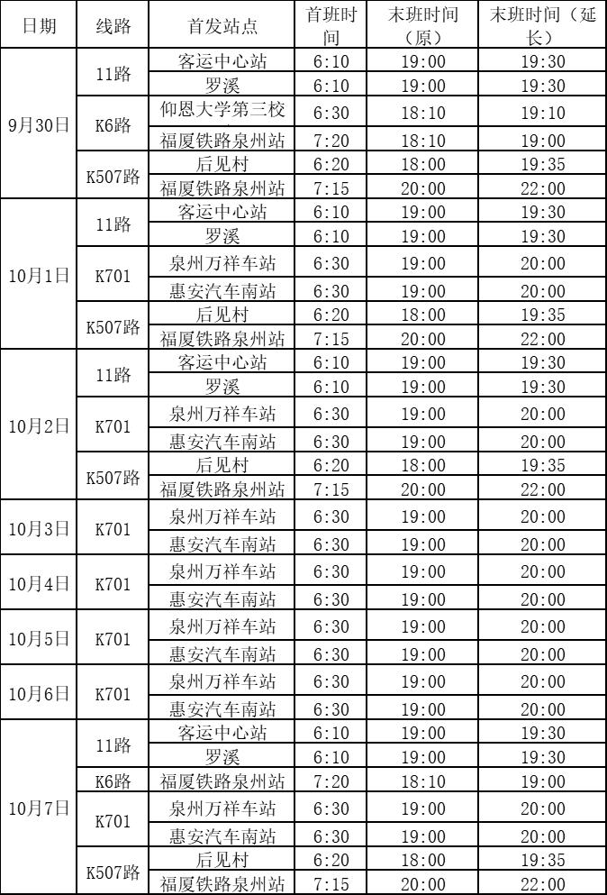 9月30日至10月7日共对4条线路延长末班服务时间。同时为满足市民游客在古城游玩的需求,社区巴士“小白”全部投入运营,根据客流峰段加密班次,并于10月1日至10月77日延长服务时间至22:30。