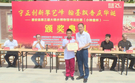 向获奖同学颁奖 据了解,螺阳镇大锦水博物馆中小学生书法比赛至今已举办三届,从第一届仅有锦水小学、锦水中学二校学生参加,到第二届全螺阳镇中小学生参赛,再到第三届全县中小学生参赛,赛事规模不断扩大,参与的学生越来越多,关注与支持的单位领导、企业家及社会各界人士也越来越多。活动不仅为广大青少年书法爱好者提供了展示自我、交流学习的平台,也进一步激发了他们的创作热情,促进了书法艺术的交流与发展。(惠安县融媒体中心记者 | 张惠玲 张钊权)