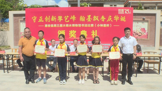 为庆祝中华人民共和国成立75周年,9月30日,惠安县螺阳镇大锦水博物馆举行第三届中小学生书法比赛颁奖典礼暨书法展开幕式,以一场书法文化盛宴,传承中华民族传统文化精髓,表达了对祖国母亲的拳拳爱意。 活动现场,向获得第三届大锦水博物馆书法比赛(小神童杯)一、二、三等奖及优秀奖的选手颁奖。当天,以“守正创新攀艺峰 翰墨飘香庆华诞”为主题的优秀书法作品在大锦水博物馆正式展出,展览为期半个月。