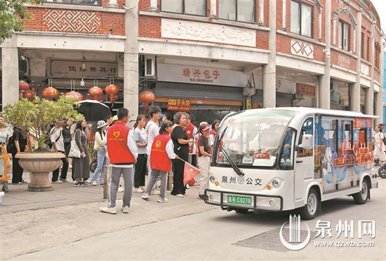 在泉州天后宫景区旁,游客排队搭乘“小白”公交,志愿者在一旁维持秩序。(泉州晚报融媒体记者陈明华 摄)