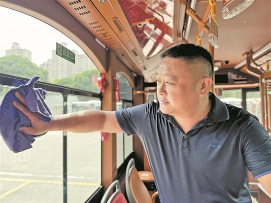 陈戴云发车前清理铛铛车 (公交集团供图)