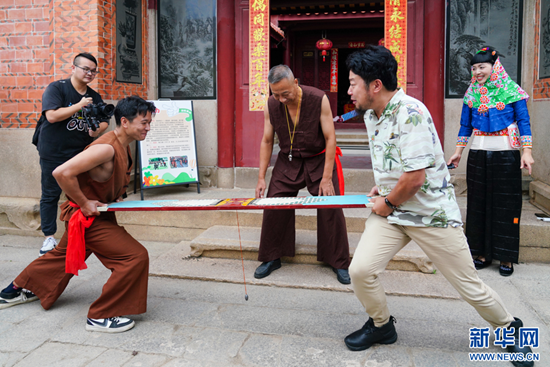 1月14日,网络大V与渔民角力,感受当地特色民俗活动。新华网 肖和勇 摄
