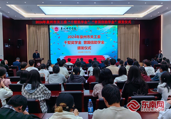 颁发仪式现场。东南网记者 陈培源 摄 东南网11月27日讯(本网记者 陈培源 通讯员 阚乃同)为激励广大青年学子修身立德、学好知识、增长才干,努力成长为堪当强国建设、民族复兴大任的栋梁之才,11月27日,2024年泉州市关工委“千墅奖学金”“曾国信助学金”颁发仪式在泉州师范学院举行,现场为30位获奖学生颁发荣誉证书及奖助学金。 “此次活动,不仅是对同学们学业成绩的一种肯定和鼓励,更是广大企业和爱心人士社会责任感的生动体现,传递着社会各界对教育事业的高度重视、对青年一代成长成才的殷切期望。”泉州市关工委主任林万明希望学子们志存高远,把个人的理想与国家的发展、民族的振兴紧密结合起来,为实现中华民族伟大复兴的中国梦和个人自身价值而努力前行,以只争朝夕的精神,努力学习科学文化知识,提高自身素质,练就过硬本领,为将来报效祖国、服务社会打下坚实基础,同时,常怀感恩之心,常为感恩之行,让这份爱心和温暖不断延续下去。” “十分感谢市关工委和社会各界爱心人士对我们的支持与鼓励。”获奖学生代表吴施瑾表示,“我们会更加珍惜这份荣誉,保持热辣滚烫的赤子之心,以饱满的热情和坚定的步伐迈向星辰大海。这份关怀,也将引导我们奋斗不息、臻于至善。” 据介绍,“千墅奖学金”“曾国信助学金”是泉州市关工委爱心助学工作的重要组成部分。2008年,在市关工委的推动下,旅港乡贤苏千墅在泉州师范学院设立“泉州市关工委千墅奖学金”,用于奖励品学兼优的学生,至今已奖励了近500名优秀学子,产生了良好的励志效应和社会反响。今年,泉州市关工委、泉州市汽车同业协会会长曾国信共同在泉州师范学院增设“曾国信助学金”,旨在奖励资助优秀学子,助力泉州市教育事业发展。 活动期间,泉州市关工委报告团成员、晋江市南侨中学高级教师谭辉作《牢记使命,立德树人——认真学习习近平总书记关于教育的重要论述》主题宣讲,引导广大师生认真学习贯彻习近平总书记在全国教育大会上的重要讲话精神,落实立德树人根本任务,培养担当民族复兴大任的时代新人。 |