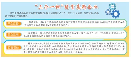 “三个一批”培育高新企业 致力于推动高新企业队伍扩容提质,泉州创新推行“三个一批”(千企后备、百企登高、百高晋位)高新企业培育法。 千企后备 精选储备一批,每年精准筛选高新企业种子培育库优质企业2000家以上,2023年累计评价入库科技型中小企业2528家,数量位居全省第二。 百企登高 精心辅导一批,推广运用高新企业申报预诊断APP小程序,加强“一对一”申报辅导,分区域、分产业、分专业组织高新企业培育辅导培训30场次。 百高晋位 精准扶强一批,出台《泉州市培育壮大高新技术企业若干措施》,推出高新企业“免审即入”标准化园区、研发投入分级激励等10条创新措施,在全省率先对高新企业高研发投入给予最高200万元奖励;对高新企业认定实行分档奖励,对营收2000万元以上企业首次认定高新企业给予叠加奖励,全市累计培育认定省科技小巨人企业716家,总量位居全省第二。(泉州晚报融媒体记者王树帆) |