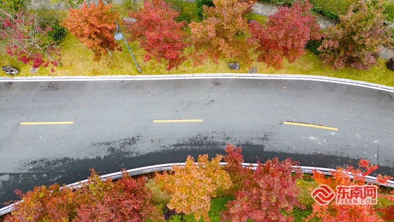 据悉,九仙山位于泉州市德化县西北部,处于赤水镇、上涌镇、大铭乡交界处,主峰海拔1658米,是古代闽南重要的旅游胜地。随着气温逐渐下降,景区内的枫叶被大自然染上了绚丽的色彩,道路两旁的红叶与山水相互映衬,构成了一幅五彩斑斓的秋日画卷。
