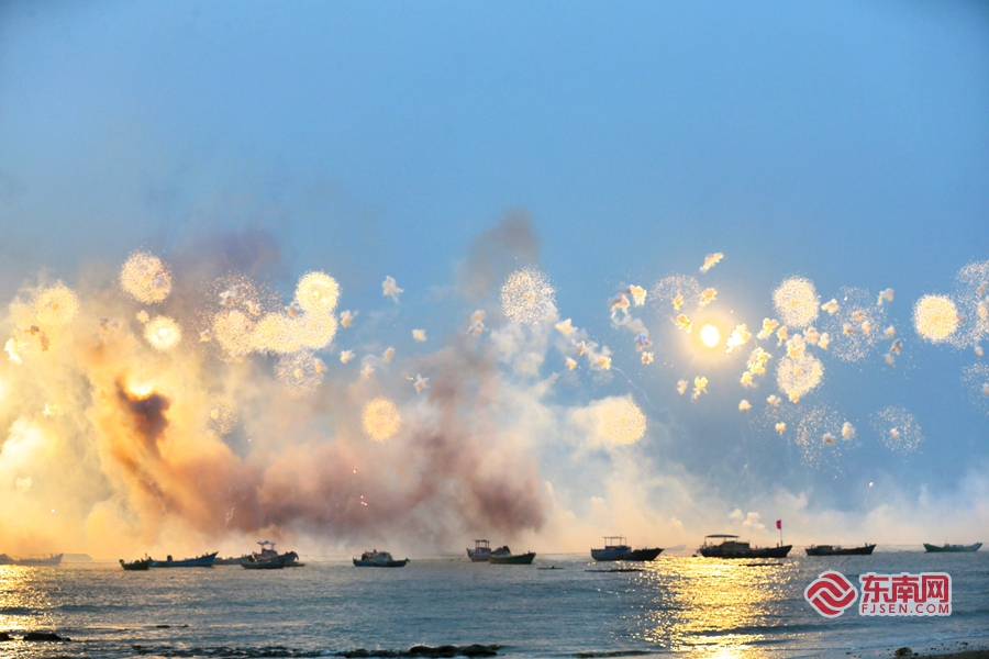 橙黄色烟花在白色烟雾中绽放,海边的船只见证这美丽瞬间。 东南网记者 杜志鑫 摄