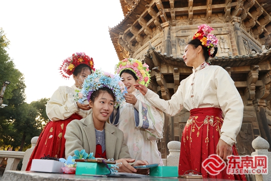 活动现场。庄丽祥 摄 东南网1月13日讯(本网记者 施远圻 通讯员 龚翠玲)近日,泉州开元寺东塔附近,一场“讲好泉州故事 赋能文旅融合”主题公益活动举行。现场,泉州市工商旅游职业中专学校“点亮人生”省级名班主任工作室的老师及该校的学生为游客们带来了免费的公益簪花及景点讲解服务,广受游客好评。当天,他们还前往泉州少林寺、真武庙等地开展相关公益活动。 将长发用红头绳扎成高马尾,再将马尾拧成螺旋一圈圈盘在后脑勺上,盘成扁平的圆髻,髻心插入一根象牙筷来固定头发……现场,师生当起了志愿者,动作娴熟利落,很快,便做好了精美的簪花围。“这是我第一次簪花,老师簪得很好。”小叶同学是一位大一学生,趁着放假和父母同游开元寺。看到有公益活动,小叶同学和妈妈一起美美地簪了花,这为他们的旅途增添了不少乐趣。 “这是东西塔中的东塔,东塔又名镇国塔……”除了簪花,师生们还主动为现场的游客做起了讲解,收获不少称赞。 据该校高级讲师、“点亮人生”省级名班主任工作室领衔人林文亮介绍,该校旅游服务与管理专业开设有旅游及簪花围课程。平日,老师会带学生到泉州各景点及学校打造的世遗景点仿真教学馆开展实训教学。学校还组建“泉州文旅公益小导游”志愿者,先后深入泉州各大景区景点开展志愿讲解服务。希望通过公益活动的开展,能够提供给师生更多实践的机会。