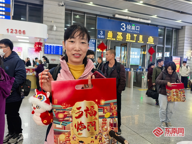 “看到这么多表演活动,感觉很热闹喜庆,很高兴。”正在候车的汪女士被激昂的鼓声吸引了过来,汪女士告诉记者,她今年打算回江西老家为母亲庆生,没想到能在上车前感受到泉州浓浓的年味儿。汪女士还收到了来自车站的春联和蛇年吉祥物:“要把这些带回家,让家人也沾沾喜气!”