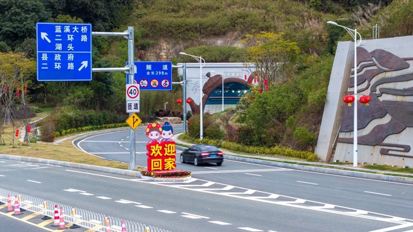 凤翔隧道入口的分岔路也“红”了可爱的人形立牌上写着“欢迎回家”向人们传递新春祝愿
