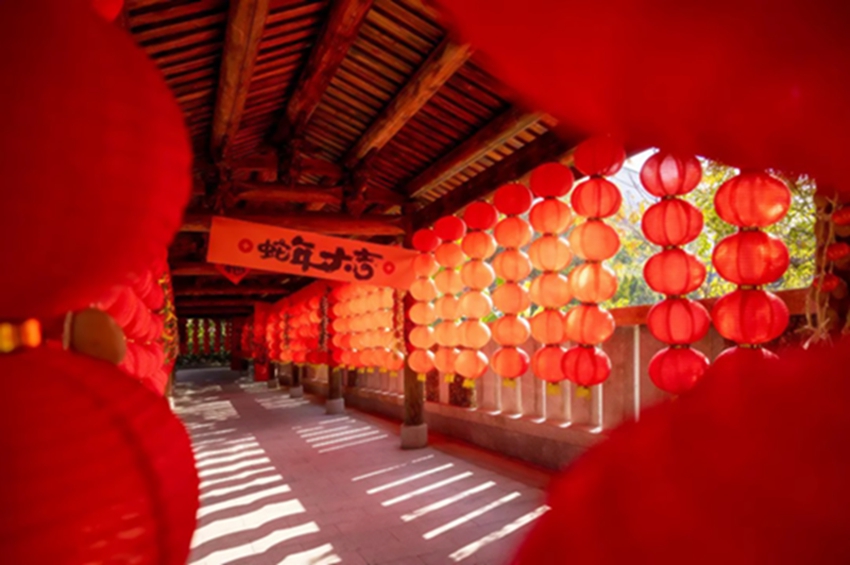 鲜艳的彩带和非遗灯笼交相辉映、随风摇曳远远看去洋溢着浓浓的喜气