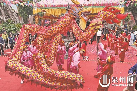 舞龙表演 (柏峰 摄) 多彩非遗为两岸“年味”增添仪式感 发布会上,新闻发言人朱凤莲介绍,蛇年春节是第一个“非遗版”春节,丰富多彩的非遗项目让今年两岸的年味多了很多仪式感。泉州市以“世遗中国年”为主题,开展“闽台两东石 共数一宫灯”、“笔墨凝香 情暖海峡”迎春送福等非遗文化活动。 蛇年春节,泉州的非遗文化活动极为丰富。泉州各县市区举办的“金蛇献瑞·刺桐‘宋’福”非遗游园会成为一道独特的风景线。火鼎公婆、五祖拳、拍胸舞等100多项民俗展示亮相古城地标、世界遗产点和人气景区,让市民游客“零距离”感受非遗的艺术魅力。正月初六晚,在泉州府文庙前广场,一场主题为“穿越宋元奇妙游”的时尚秀惊艳开场,融合“世遗、非遗、时尚、秀场”四大元素,以南琶为舞台造型,生动展现南音、南戏、南建筑、南拳、南派工艺、南风俗等非遗技艺之美和匠心之美。