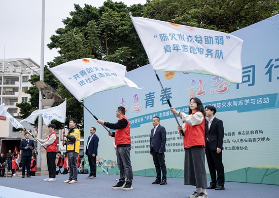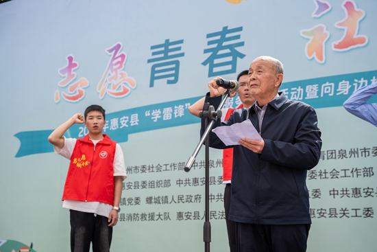 全国优秀共产党员、全国离退休干部先进个人、全国最美志愿者陈欠水带领全体志愿者宣誓。惠安县委宣传部 供图 为深入贯彻落实党的二十大和二十届二中、三中全会精神,充分发挥身边榜样的示范带动和引领作用,在全国学雷锋活动开展62周年之际,3月2日上午,惠安县举行2025年“学雷锋”志愿服务主题活动暨向身边榜样陈欠水同志学习活动启动仪式。 惠安县委、县政府向投身志愿服务事业的社工同仁、志愿者朋友,致以崇高敬意与美好祝愿。雷锋精神,是永不褪色的精神丰碑,60多年来,“为人民服务”的信念始终流淌在中国人的血脉中。35年来,陈欠水始终奔走在扶困助弱的志愿服务道路上,为残疾人和困难群众送去党和政府的温暖,用实际行动践行了一名共产党员的初心使命,是每个人学习的榜样。 主办方强调,要做好“专业社工+志愿服务+青年力量”的深度融合,构建“以专业引领服务、以服务锤炼青年、以青年反哺社会”的良性循环。以青年的创造性为引擎,做青春正能量的传递者;以社工的专业性为根基,做社会进步的推动者;以精神的传承性为保障,做志愿精神的践行者,积极学习、宣传雷锋及陈欠水的事迹,让雷锋精神在新时代绽放更加璀璨的光芒。 活动现场,领导嘉宾共同推杆启动“社志同行”惠安名片工程暨青年志愿服务“五彩”主题行动,以此团结带领广大青年志愿者和社工在服务基层、服务社会中赓续雷锋精神、淬炼优秀品格、强化使命担当;随后,向“陈欠水扶贫助弱”青年志愿服务队、“共青团义务星期六”(进社区)志愿服务队、惠安县美团“轻骑”志愿服务队、县医院志愿服务队四支志愿服务队伍代表授旗,多支志愿队伍的加入,为惠安县的志愿服务事业注入源源不断的活力。 现场还发布了惠安县星级青年志愿者争创提升行动、2025年惠安县“社工+志愿”项目大赛预告;进行主题朗诵《绘就五彩志愿青春——诵<雷锋日记>》;宣讲身边榜样陈欠水同志的先进事迹;宣读《2025年“学雷锋 做志愿 服务改革建新功”倡议书》。 活动在全体志愿者的宣誓声中落下帷幕。在与会领导嘉宾见证下,在陈欠水的带领下,在场所有青年志愿者和社工起立庄严宣誓,志愿成为一名光荣的志愿者。从陈欠水的感人故事中,从身边榜样的带领中,触摸坚守的温度、担当的重量,感召越来越多青年加入志愿者和社工的队伍。(惠安县委宣传部 惠安团县委)