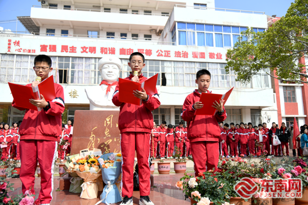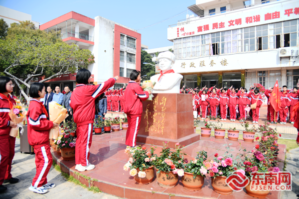 学生代表向雷锋塑像敬献鲜花。惠安一中 供图