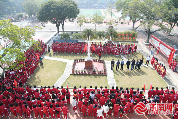 活动现场。惠安一中 供图 仪式在庄重肃穆的氛围中拉开帷幕。初一年段全体学生整齐列队,环绕雷锋塑像,表达对雷锋同志的崇高敬意。在学生代表的指挥下,全体学生齐唱经典歌曲《学习雷锋好榜样》,嘹亮的歌声展现了学子们对雷锋奉献精神的赞美与传承。 随后,学生代表上台为雷锋塑像佩戴红领巾,象征着雷锋与同学们心灵相通的情感纽带。在老师的带领下,全体学生向雷锋塑像敬礼,各班学生代表依次献上鲜花,表达对雷锋同志的深切缅怀。 “你是高山岩石之松,在狂风暴雨中成长……”。活动现场,三位学生代表为雷锋献词,慷慨激昂地朗诵了赞颂雷锋精神的诗篇。他们身着红色校服,胸前的红领巾在阳光下熠熠生辉,展现了新时代青少年对雷锋精神的深刻理解与传承决心。
