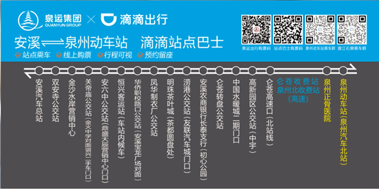 安溪-泉州动车站(北站)线路滴滴站点。泉州交发集团 供图 线路站点: 安溪-泉州动车站(北站)线路:双安寺公交站-金沙水岸营销中心-关帝庙公交站(金火中学对面谊兴二手车门口)-安六中公交站(鼎盛天辰营销中心门口)-恒兴客运站(车站内候车)-华侨职校路口公交站(安溪宝龙广场对面)-凤华制衣厂公交站-明珠茶叶城(茶都圆盘处)-涝港公交站(友联汽车城门口)-安溪农商银行长泰支行(初心公园)-仑苍转盘公交站-中国水暖城二期门口-高新园区公交站(中宇)-仑苍高速口(北站线)-泉州正骨医院-泉州动车站(汽车北站)