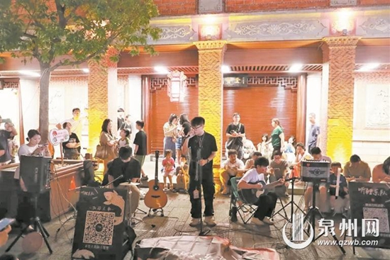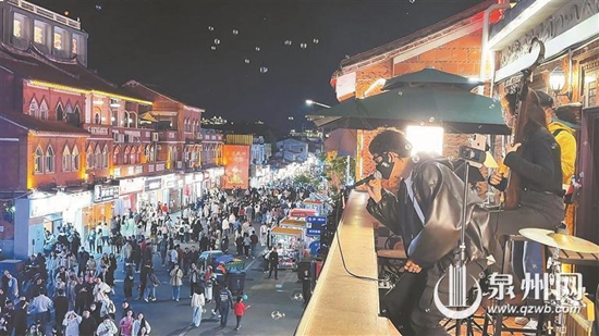 鲤城组织艺人在街头表演 “一起来!”“后来,我总算学会了,如何去爱……”3月22日晚,在西街钟楼附近的观景台上,鲤城区组织的街头艺人飞乐队带来精彩演出,令市民游客驻足沉醉。在乐队带动下,全场观众挥舞手机灯光,齐声合唱,歌声在钟楼下久久回荡。当天现场的视频在全网一经发出,便持续发酵,引起网友广泛关注。 记者获悉,这是鲤城区文旅局在西街为游客准备的沉浸式文化新体验,今后将组织不同的街头艺人在定时定点送上精彩表演,让游客与泉州这座城市产生更深层次的链接。昨日,记者再次探访现场,感受这份独特的氛围。