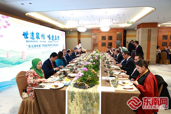 宋元海丝宴外国驻华使节专场品鉴会。石狮市委宣传部 供图 东南网3月29日讯(通讯员 薛宇翔 本网记者 谢玉妹)3月28日,北京福建大厦内丝竹绕梁、海韵飘香,作为北京福建会客厅系列活动之一的“世遗泉州 味连五洲”宋元海丝宴外国驻华使节专场品鉴会在此举行,开启了一场跨越时空的味觉与文化盛宴。来自希腊、黑山、巴拿马等25个国家的驻华大使和高级外交官及有关国际组织驻华代表约50人受邀到场品鉴,感受泉州的美食魅力与深厚的海丝文化积淀。 2021年,“泉州:宋元中国的世界海洋商贸中心”成功列入《世界遗产名录》,22处遗产点串联起一部“海洋商贸史诗”。 千年之前,泉州作为古代海上丝绸之路的重要起点,见证了“涨海声中万国商”的盛景:商贾云集、舟楫林立,陶瓷、丝绸与来自异域的香料在此交汇,东西方的智慧与文明在此碰撞交融,孕育出开放包容、多元共生的海丝精神。海上丝绸之路的的开启,也给泉州带来更加丰富多元的新食材、调料和烹饪方式,形成当地独特的美食文化。 |