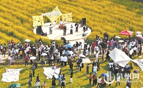 模特走秀、电声乐队、民谣吉他表演……近日,惠安县举办首届华光春季花田音乐会,大批市民游客前来打卡,在百亩油菜花海中沉浸式享受时尚音乐盛宴。图为音乐会现场。(黄健 张文璟 摄) |