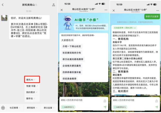 当印尼沙爹的香气遇见AI算法,当印尼归侨的古早味咖啡香融入数字服务,这座承载着六百多年侨乡记忆的闽南社区正焕发新生。近日,洛江区双阳街道南山社区正式接入DeepSeek大模型,成功训练全国首个侨乡特色AI助“小侨”,以“数据活化-场景再造-服务升维”三阶创新,让社区智慧治理的春风吹进千家万户。 【智脑筑基:侨乡数据全要素重构】 南山社区是一个以安置印尼峇厘省回国的归侨为主的社区,是海内外著名的中国“峇厘村”。社区积极挖掘侨文化资源,将散落的侨史档案、便民网点、特色商户等23类数据注入DeepSeek系统。如今,“小侨”已深度掌握社区内106项政务服务流程、一园一街一馆侨文化地标、12家印尼特色餐饮商户信息,构建起涵盖“民生政策库”“企业服务库”“侨乡文化库”的三大知识图谱。