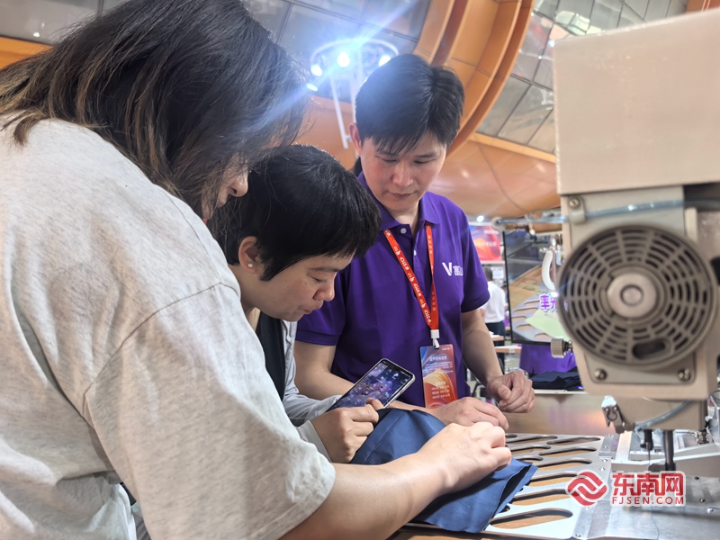 客商正在仔细观察智能缝纫机所缝纫的针脚。东南网记者 谢玉妹 摄